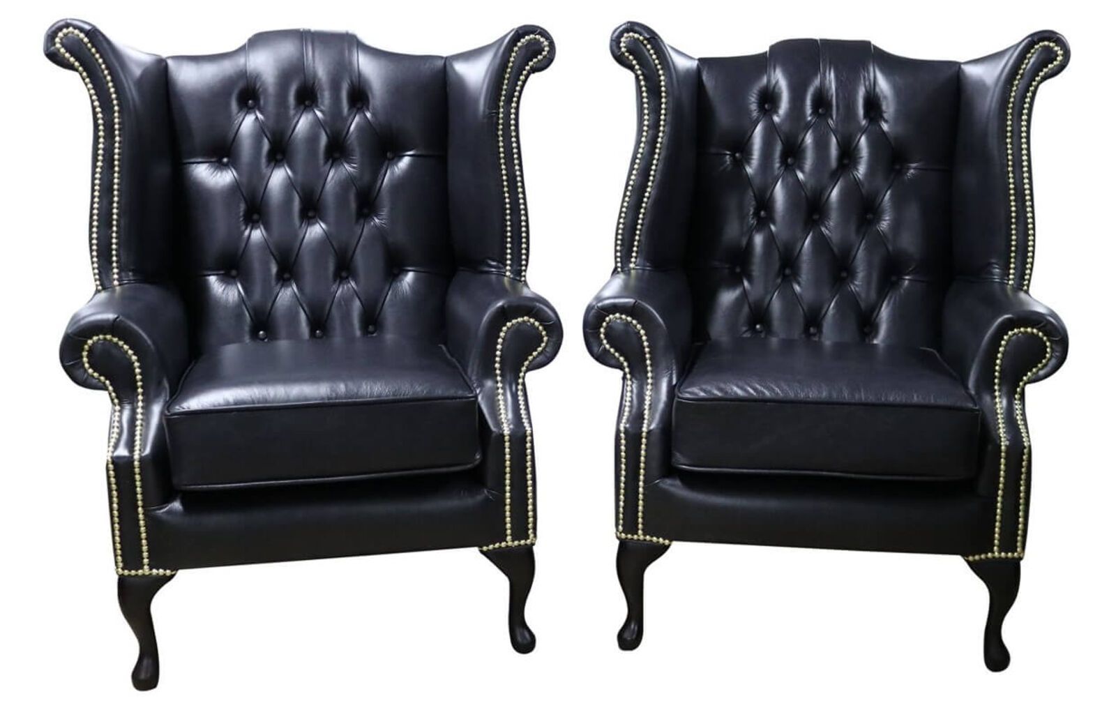 Our review of the 2 X Chesterfield Georgian Queen Anne High Back Wing Chairs Old English Black Leather