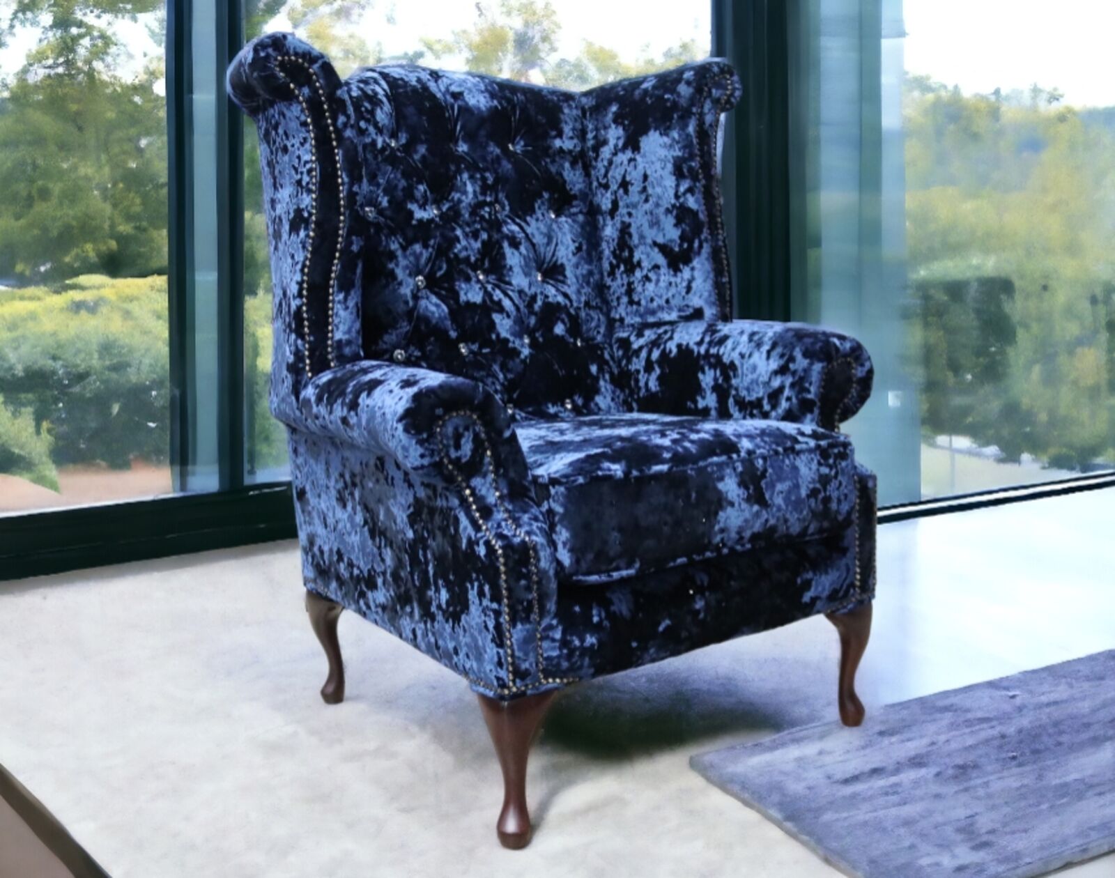 Blue Sapphire Velvet Chesterfield Crystal Queen Anne High Back Wing Chair Designersofas4u