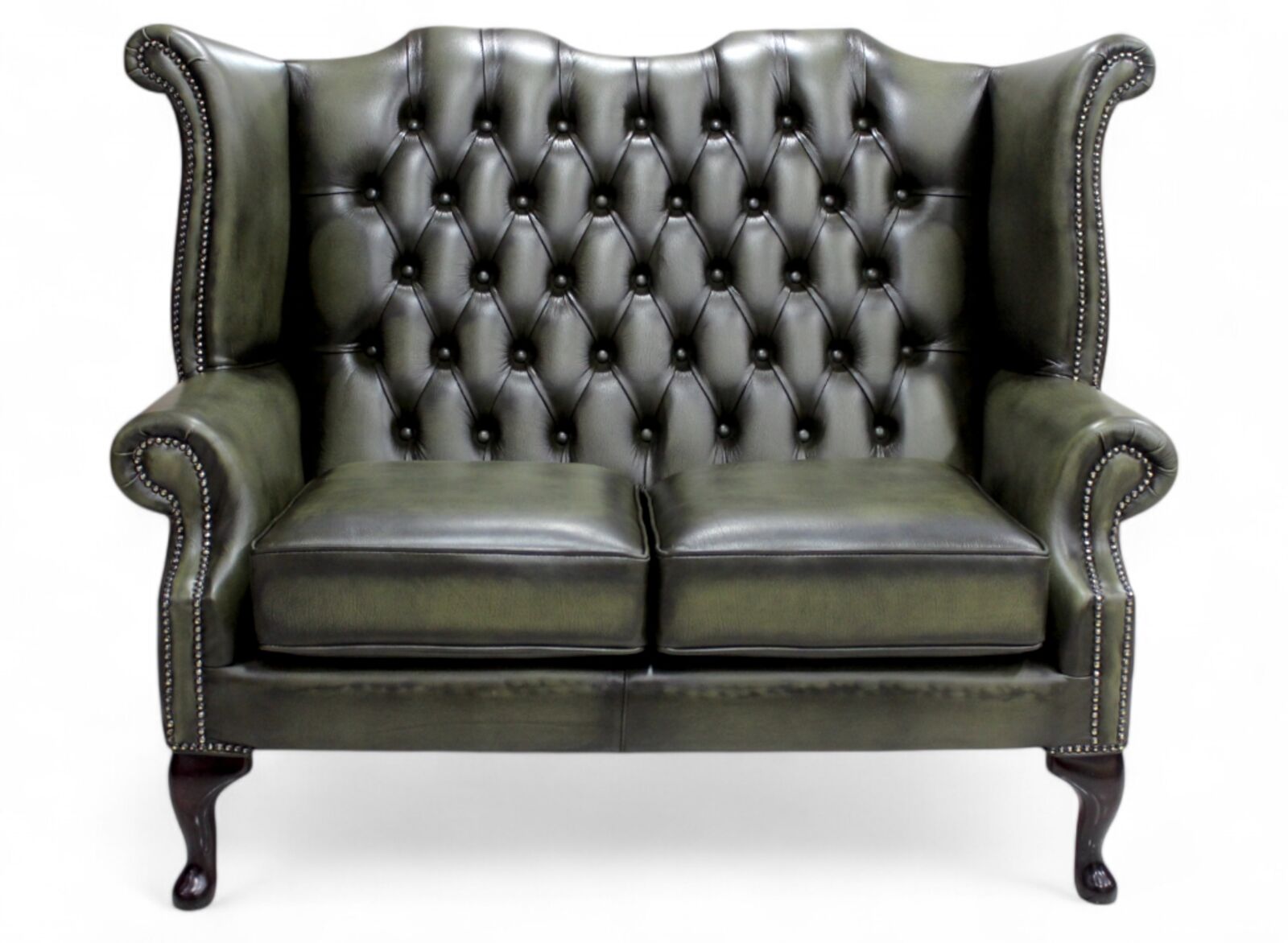 Chesterfield 2 Seater Queen Anne High Back Wing Sofa Antique Olive Leather