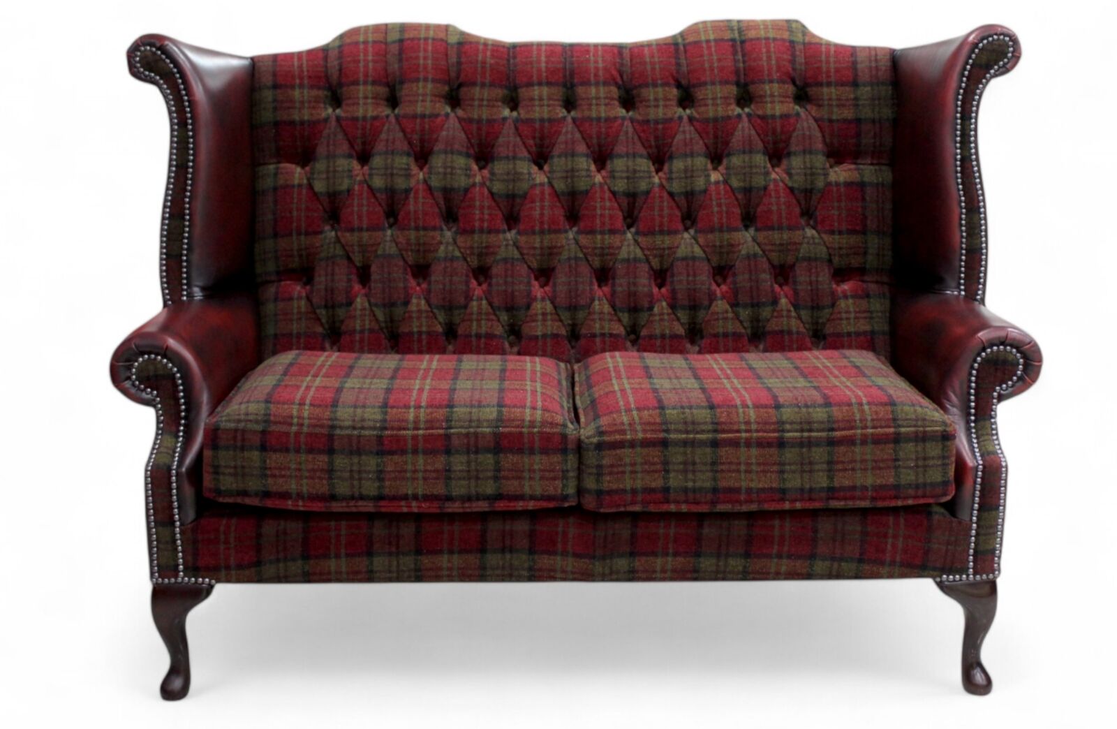 HANDCRAFTED IN ENGLAND Our winged high-back Chesterfield Queen Anne Sofa with exposed hardwood leg detail. A very popular look in the Queen Anne Style - Upholstered in Antique Oxblood Leather And Lana Terracotta Fabric - This Chesterfield has a high back for additional support and comfort. This piece would bring flair to any home or office space. - Hand made in Leather And Fabric - Non Tropical Screwed and glued hardwood frame made in house - Upholstered and buttoned by craftsmen - Real wood show feet Queen Anne legs - Hand studded Front and Wing Facings - From construction of the frame to filling in the cushions all is completed in house - Individual seating options (Soft, Medium, Firm) - Payment Option 50% Deposit Rest of Balance On Delivery - FREE Swatch Service - 12 Month Manufacturers Guarantee - 10 Year Manufacture Guarantee on Framework - Manufactured In England - Worldwide delivery Available 2 seater sofa Dimenision : H 105cm x D 89cm x W