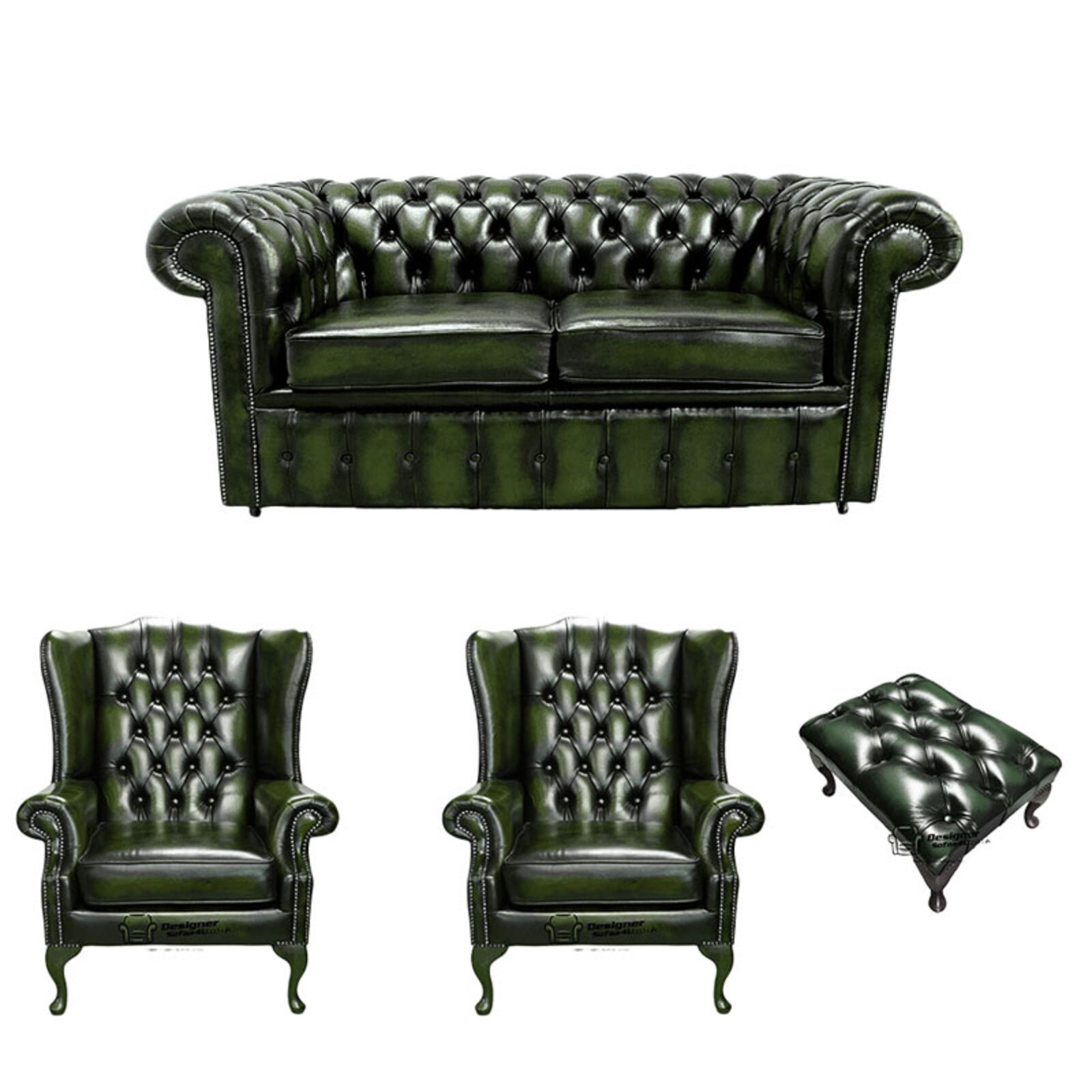 Our review of the Chesterfield 2 Seater Sofa 2 X Mallory Wing Chair Footstool Leather Sofa Suite Offer Antique Green