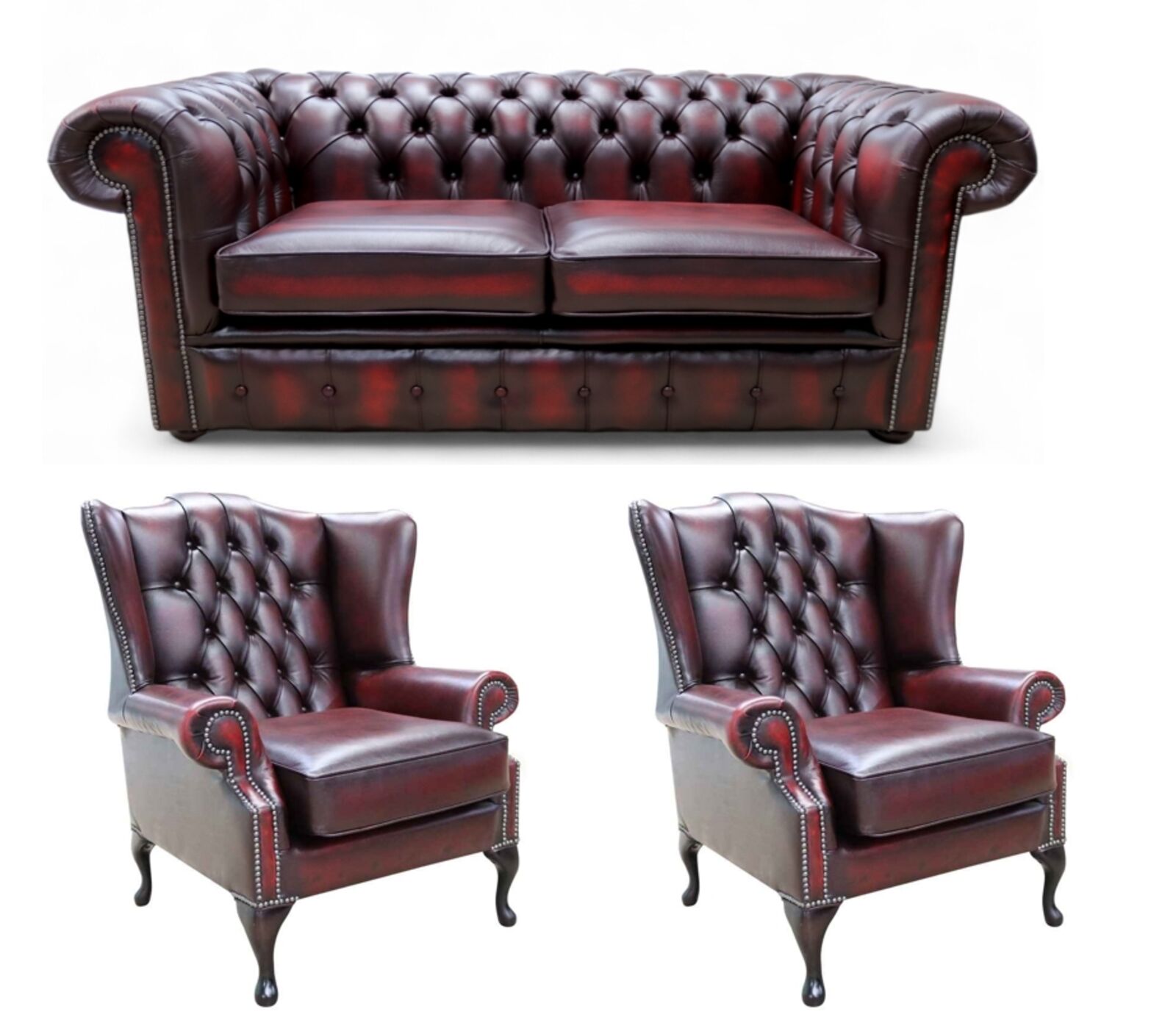 Our review of the Chesterfield 2 Seater Sofa 2 X Mallory Wing Chairs Leather Sofa Suite Offer Antique Oxblood
