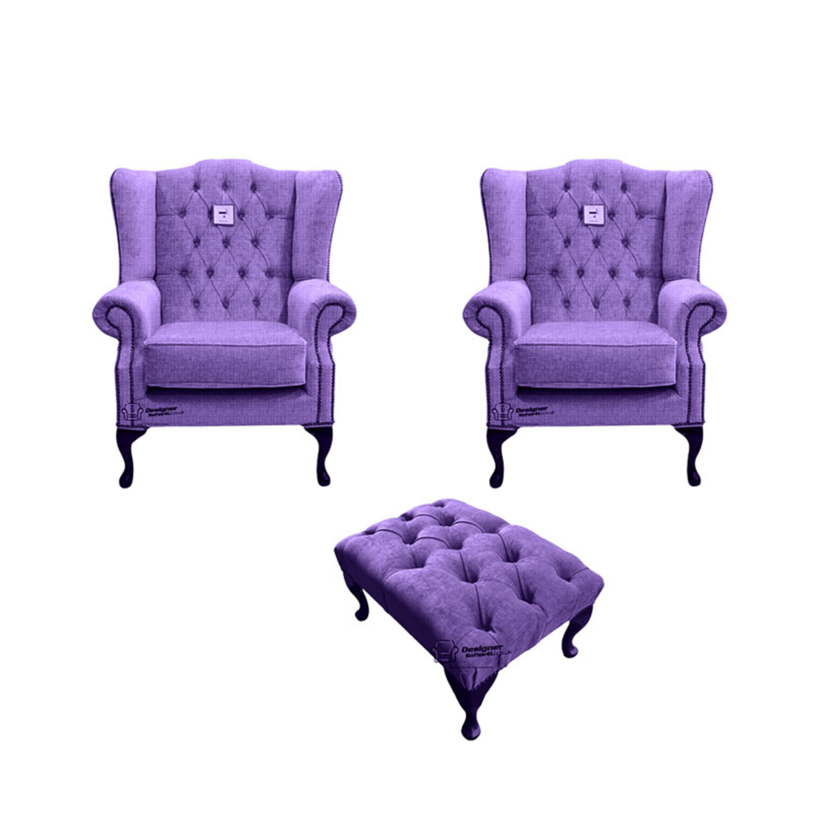Chesterfield 2 X Mallory Wing Chairs Footstool Verity Purple Fabric Sofa Suite Offer