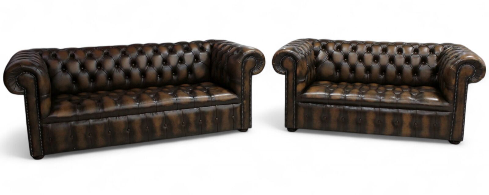 HANDCRAFTED IN ENGLAND The Chesterfield Leather Sofa with it's unique Low Back Style, Deep Buttoned Arms and Back complemented with a Double Buttoned Front Border and Buttoned Seat. The Scroll Fronted arms on the Chesterfield Leather Sofa are attractively embellished with lines of individual stud nails. An undoubted winner in any room from the cottage to the boardroom. A classic of its kind ;Traditional Vintage British Style. INTERNATIONAL SHIPPING: For a FREE International Shipping Quote, please call us on 0044 1254 268590. For rough guide to the cost of Worldwide Shipping please click here (*1). COLOUR OPTIONS: PLEASE NOTE : WE ALSO MANUFACTURE 2.5 SEATER CHESTERFIELDS. PLEASE CONTACT US ON 01254 268590 FOR MORE INFORMATION Our Chesterfield Sofas have previously featured on ITV s 60 Minute Make Over programme. Click Here (*2) to view our Chesterfield Wing Chair on the Fox's Biscuit adverts. For a LIMITED PERIOD ONLY buy our Exclusive Classic Ch