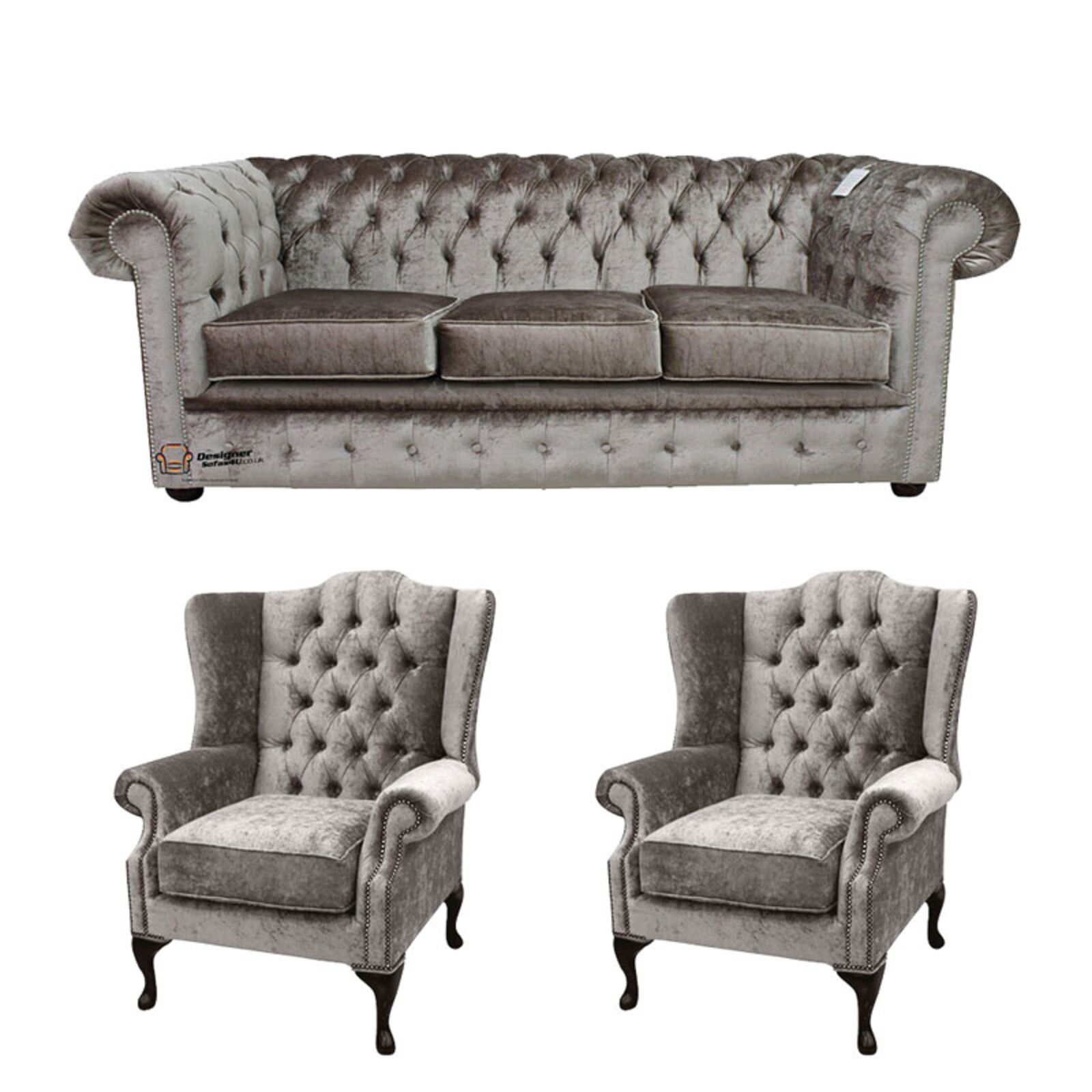 Chesterfield 3 Seater 2 X Mallory Wing Chairs Boutique Beige Velvet Sofa Suite Offer