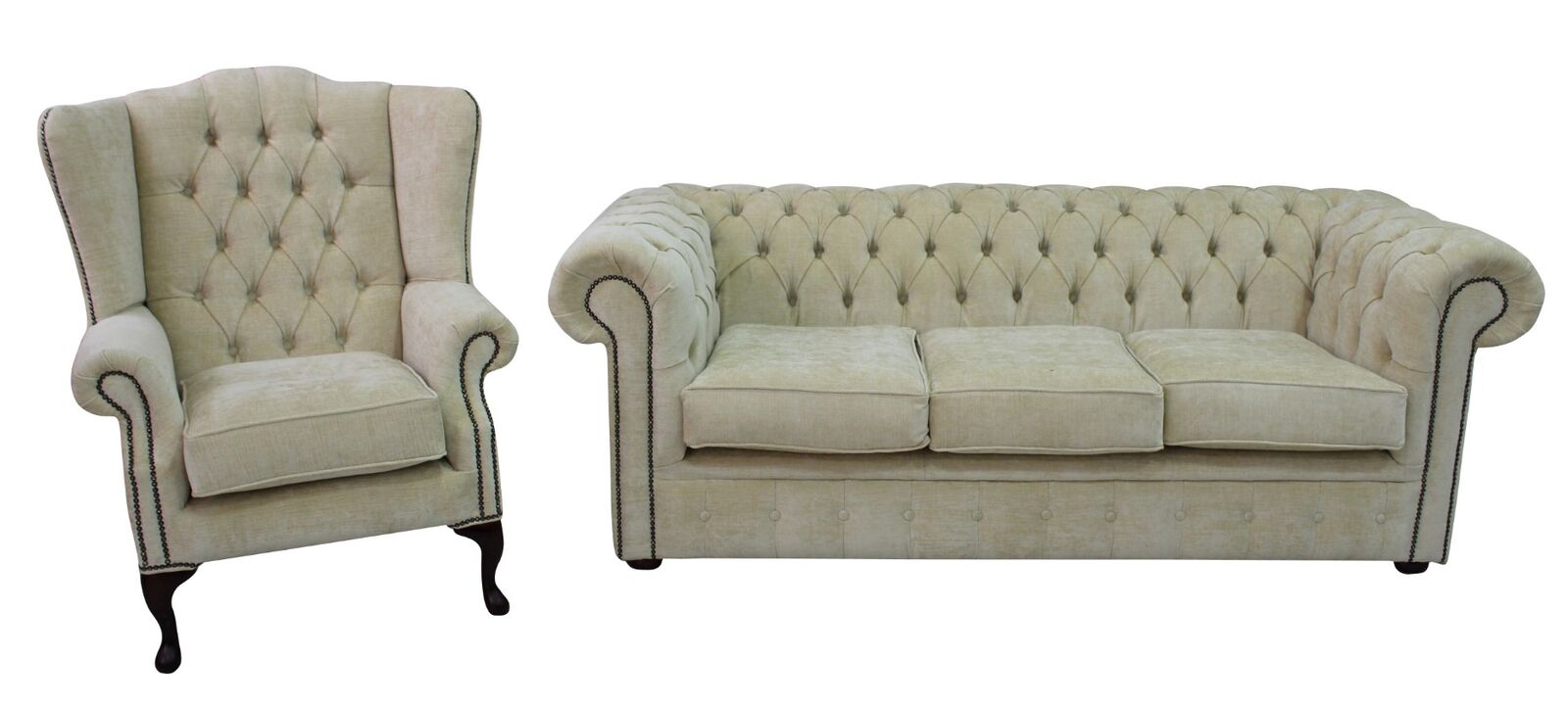 Chesterfield 3 Seater Mallory Wing Chair Velluto Chiffon Fabric Sofa Suite Offer
