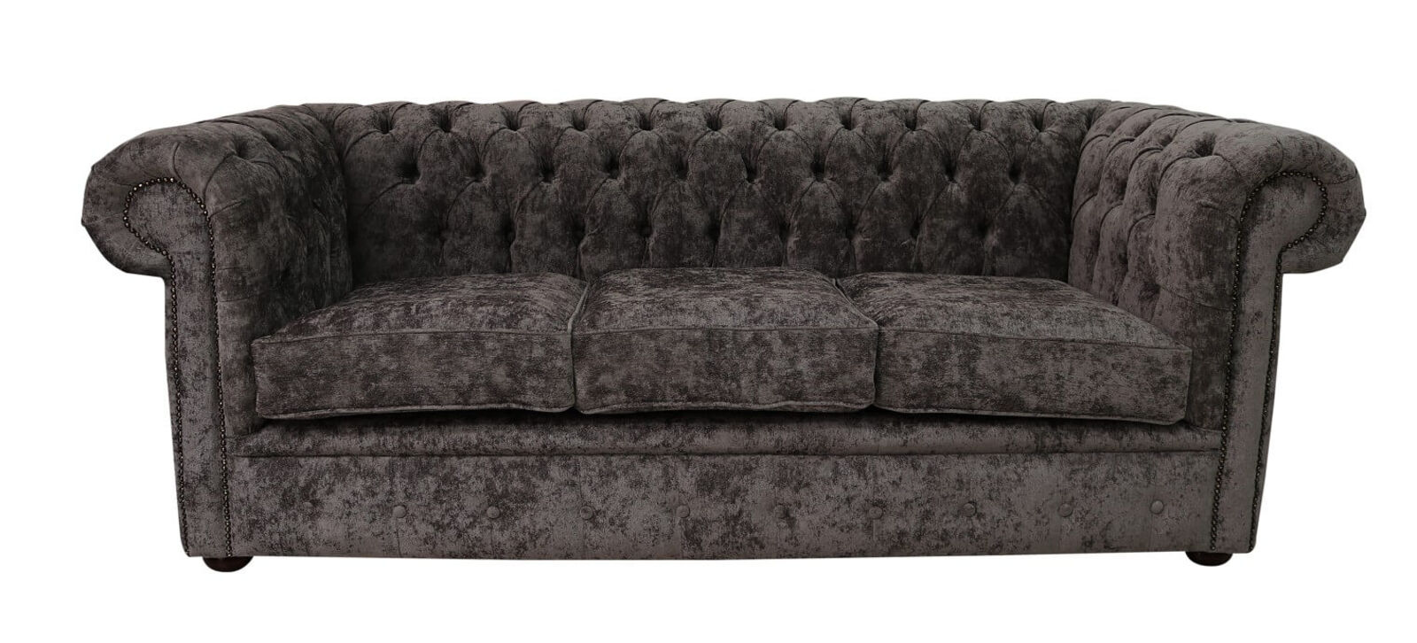 The Chesterfield Classic Sofa. The Chesterfield Fabric Sofa with it's unique Low Back Style, Deep Buttoned Arms and Back complemented with a Buttoned Front Border. The Scroll Fronted arms on the Chesterfield Leather Sofa are attractively embellished with lines of individual stud nails. An undoubted winner in any room from the cottage to the boardroom. A classic of its kind ;Traditional Vintage British Style. Handmade in Chenille - Handmade in Luxury Fabric - Non Tropical Screwed and glued hardwood frame made in house - Upholstered and buttoned by craftsmen - Real wood Bunfeet - Hand studded - From construction of the frame to filling in the cushions all is completed in house. - Individual seating options (Soft, Medium, Firm) - Payment Option 50% Deposit Rest of Balance On Delivery - FREE Swatch Service - 12 Month Manufacturers Guarantee - 10 Year Manufacture Guarantee on Framework - Manufactured In England - Worldwide delivery Available 3 Seat So