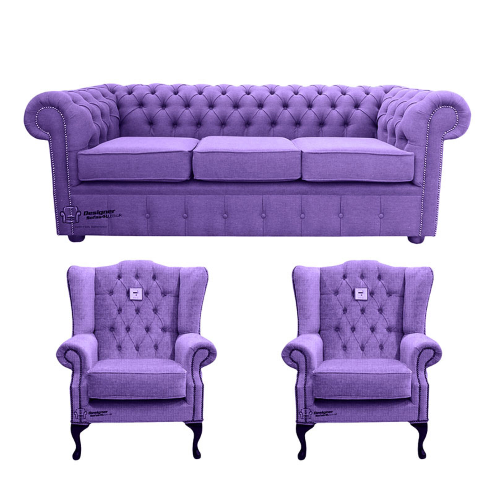 Chesterfield 3 Seater Sofa 2 X Mallory Wing Chair Verity Purple Fabric Sofa Suite Offer