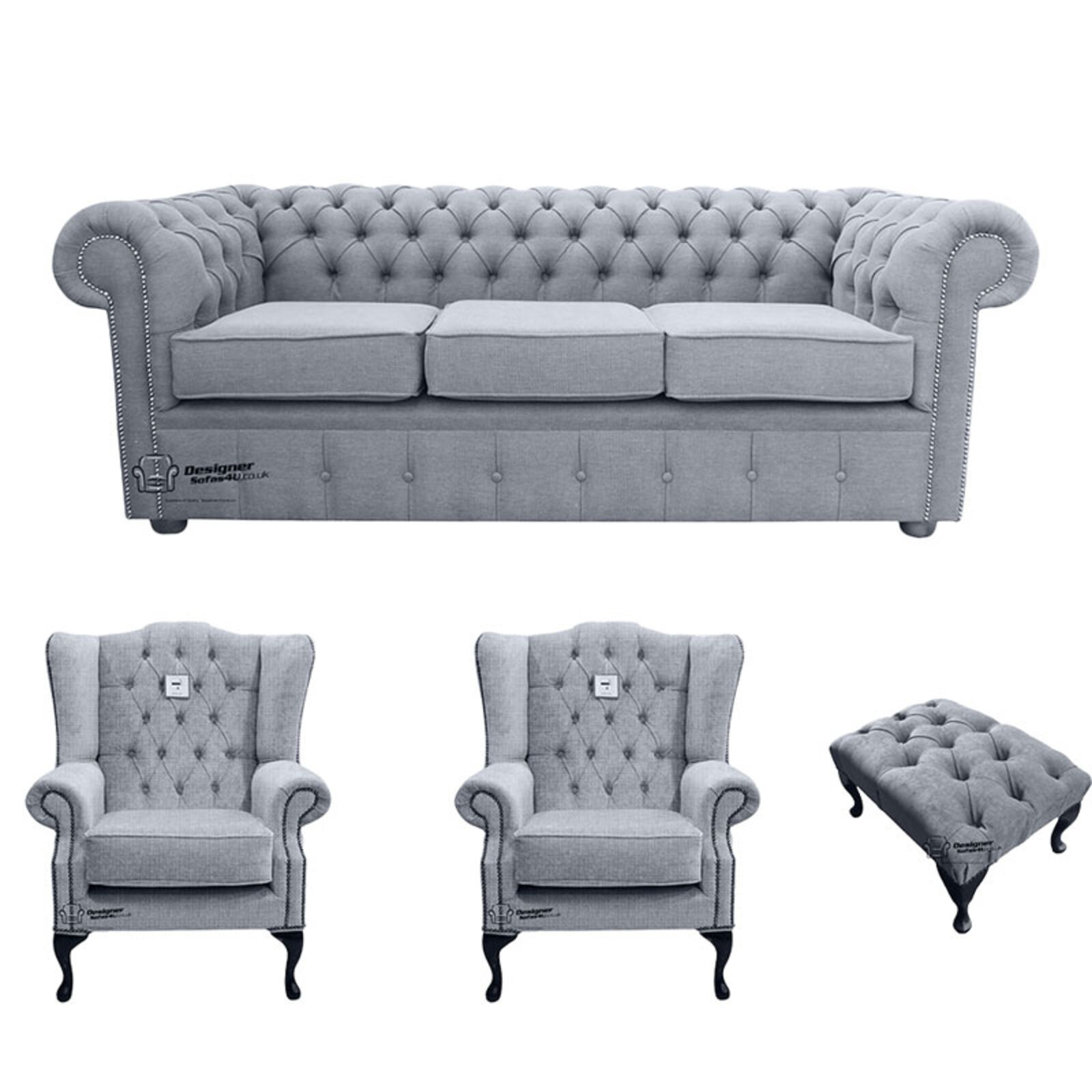Our review of the Chesterfield 3 Seater Sofa 2 X Mallory Wing Chairs Footstool Verity Plain Steel Fabric Sofa Suite Offer
