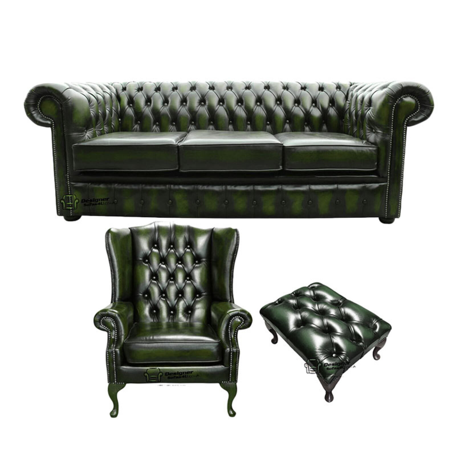 Chesterfield 3 Seater Sofa Mallory Wing Chair Footstool Leather Sofa Suite Offer Antique Green