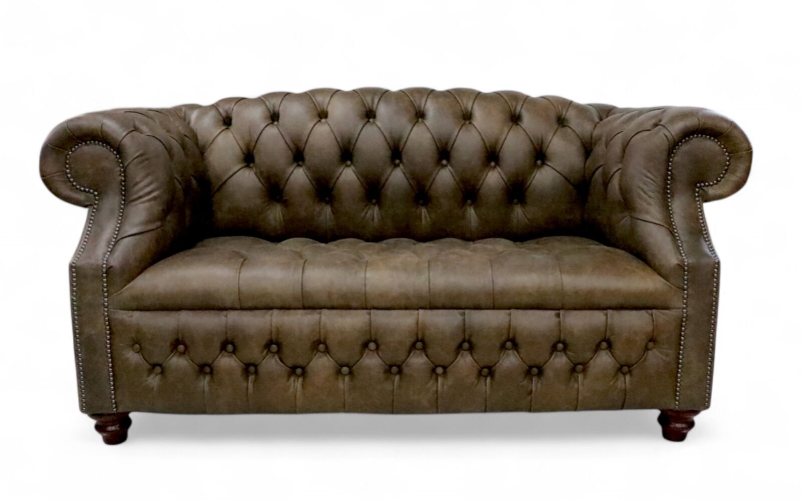 The Chesterfield Buckingham Classic Sofa. The Chesterfield Buckingham Leather Sofa with it's unique Raised Back, Deep Buttoned Arms and Back complemented with a Buttoned Front Border. The Scroll Fronted arms on the Chesterfield Leather Sofa are attractively embellished with lines of individual stud nails. An undoubted winner in any room from the cottage to the boardroom. A classic of its kind ;Traditional Vintage British Style. - Handmade in Cracked Wax Leather - Non Tropical Screwed and glued hardwood frame made in house - Upholstered and buttoned by craftsmen - Real wood Bunfeet - Hand studded - From construction of the frame to filling in the cushions all is completed in house. - Individual seating options (Soft, Medium, Firm) - Payment Option 50% Deposit Rest of Balance On Delivery - FREE Swatch Service - 12 Month Manufacturers Guarantee - 10 Year Manufacture Guarantee on Framework - Manufactured In England - Worldwide delivery Available 2 Se