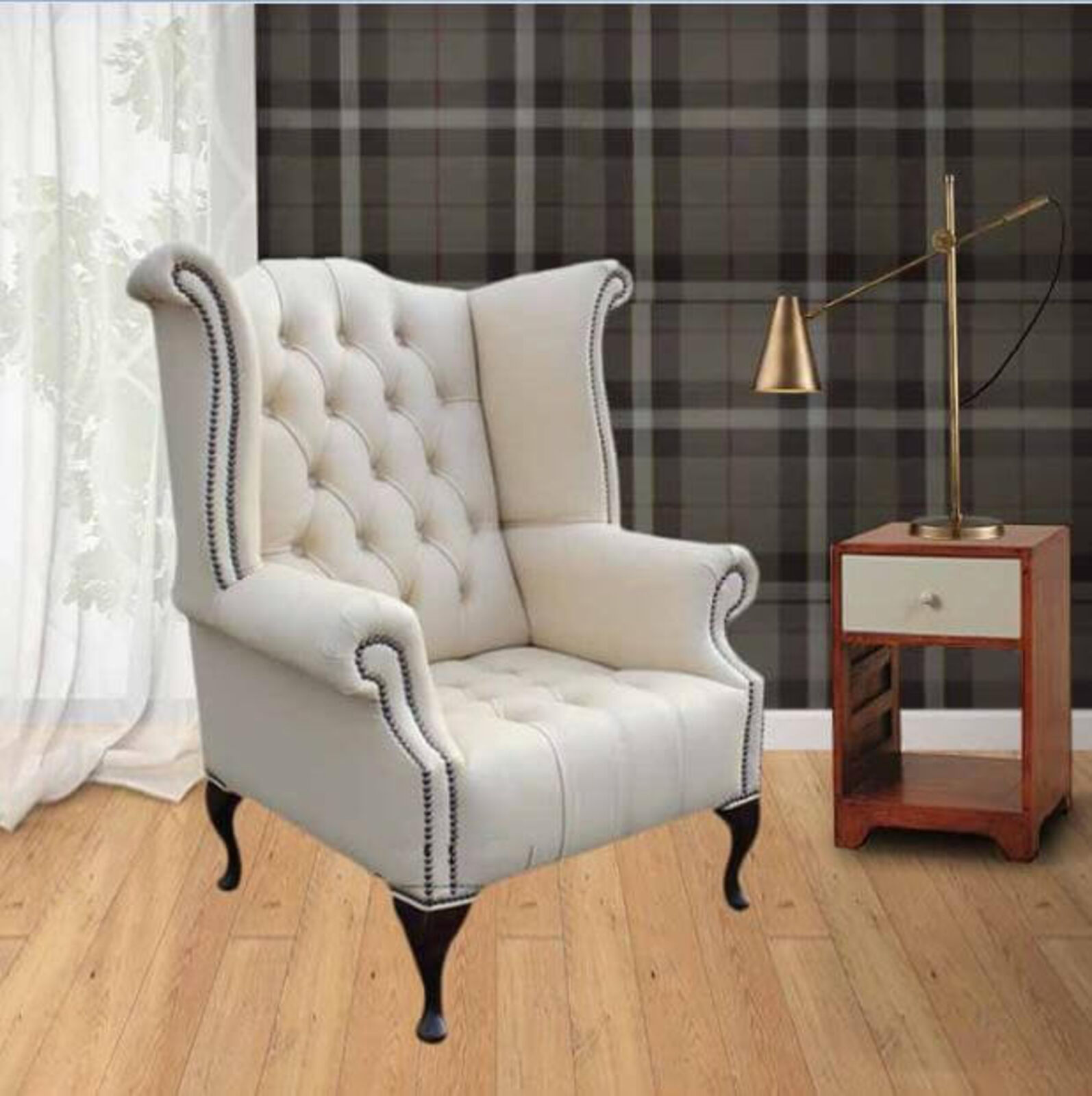 We have been looking around for a while, and we really love this Chesterfield Buttoned Queen Anne High Back Wing Chair Cottonseed Cream Leather.