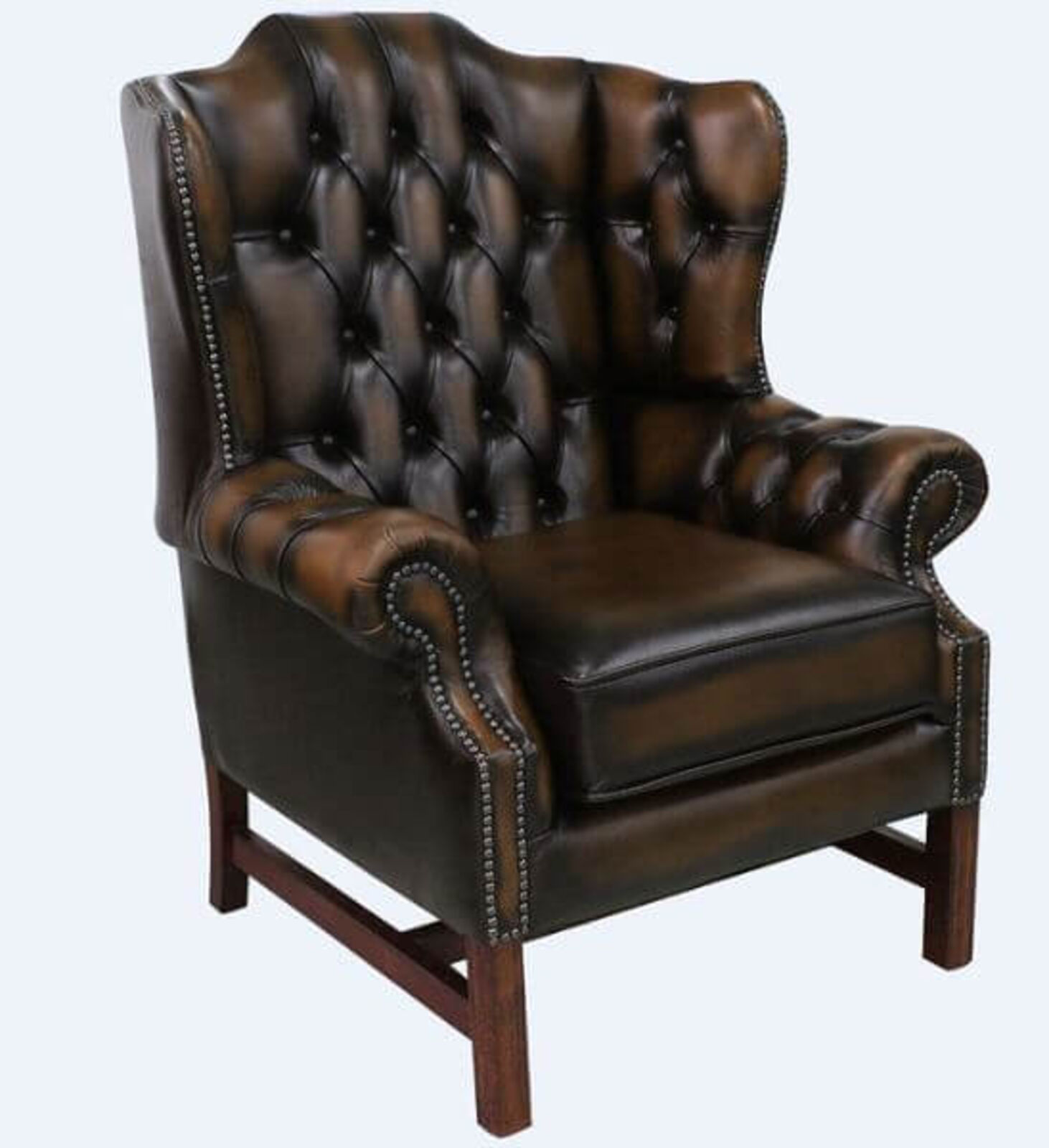 HANDCRAFTED IN ENGLAND Chesterfield Churchill Wing Back Armchair Our Vintage Chesterfield Georgian Classic Wing Chair Upholstered In Antiqued leather. It features a Solid H Frame Leg. This Chesterfield has a high back for additional support and comfort. This piece would bring flair to any home or office space. - Hand made in Antique Leather - Non Tropical Screwed and glued hardwood frame made in house - Upholstered and buttoned by craftsmen - Real Wood Soild H-Frame - Hand studded Front and Wing Facings - From construction of the frame to filling in the cushions all is completed in house - Payment Option 50% Deposit Rest of Balance On Delivery - FREE Swatch Service - 12 Month Manufacturers Guarantee - 10 Year Manufacture Guarantee on Framework - Manufactured In England - Worldwide delivery Available Wing Chair Dimensions : H 105cm x D 89cm x W 88cm apprx. Dimensions 1 seater Churchill High Back wing chair: We understand that purchasing furniture