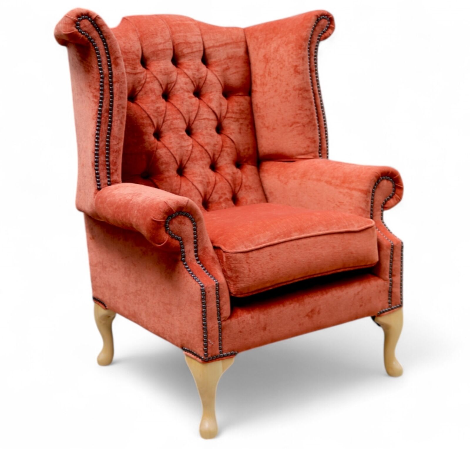 We think you deserve a treat, and you can’t get much better than this Chesterfield Fabric Queen Anne High Back Wing Chair Pimlico Copper.