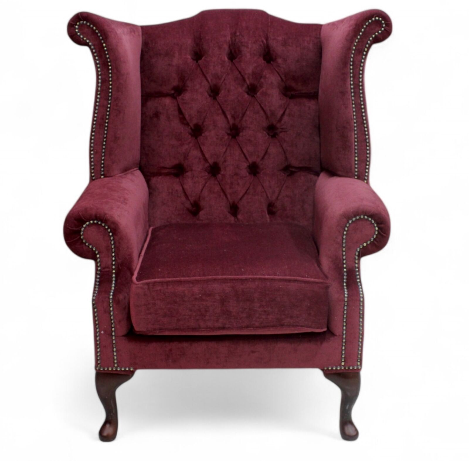 Chesterfield Fabric Queen Anne High Back Wing Chair Pimlico Wine