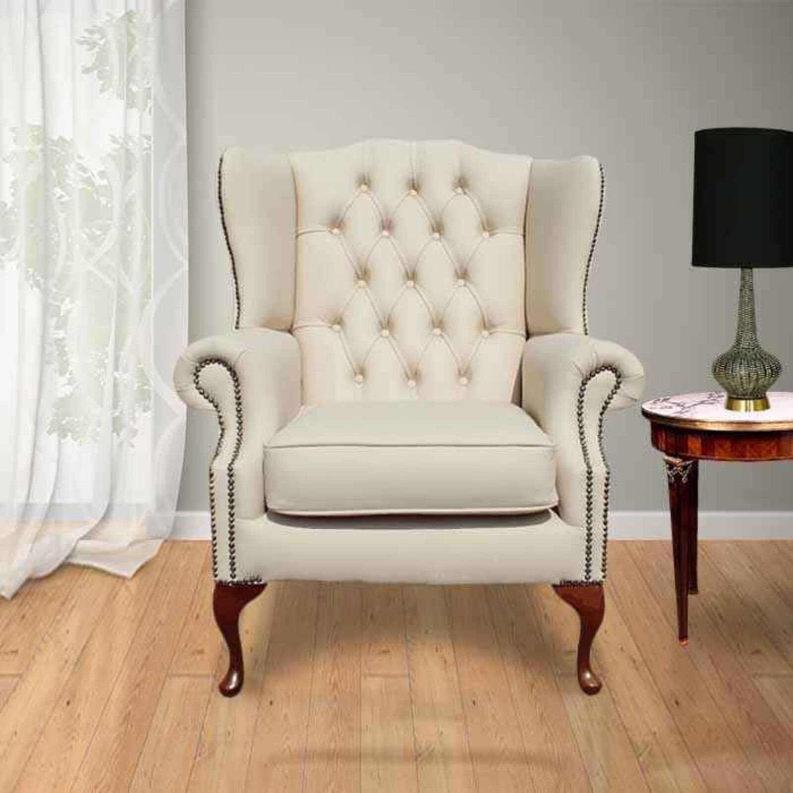 We love sophisticated living, and think that this Chesterfield Highclere Flat Wing Queen Anne High Back Wing Chair Uk Manufactured Cream Leather really hits the mark!