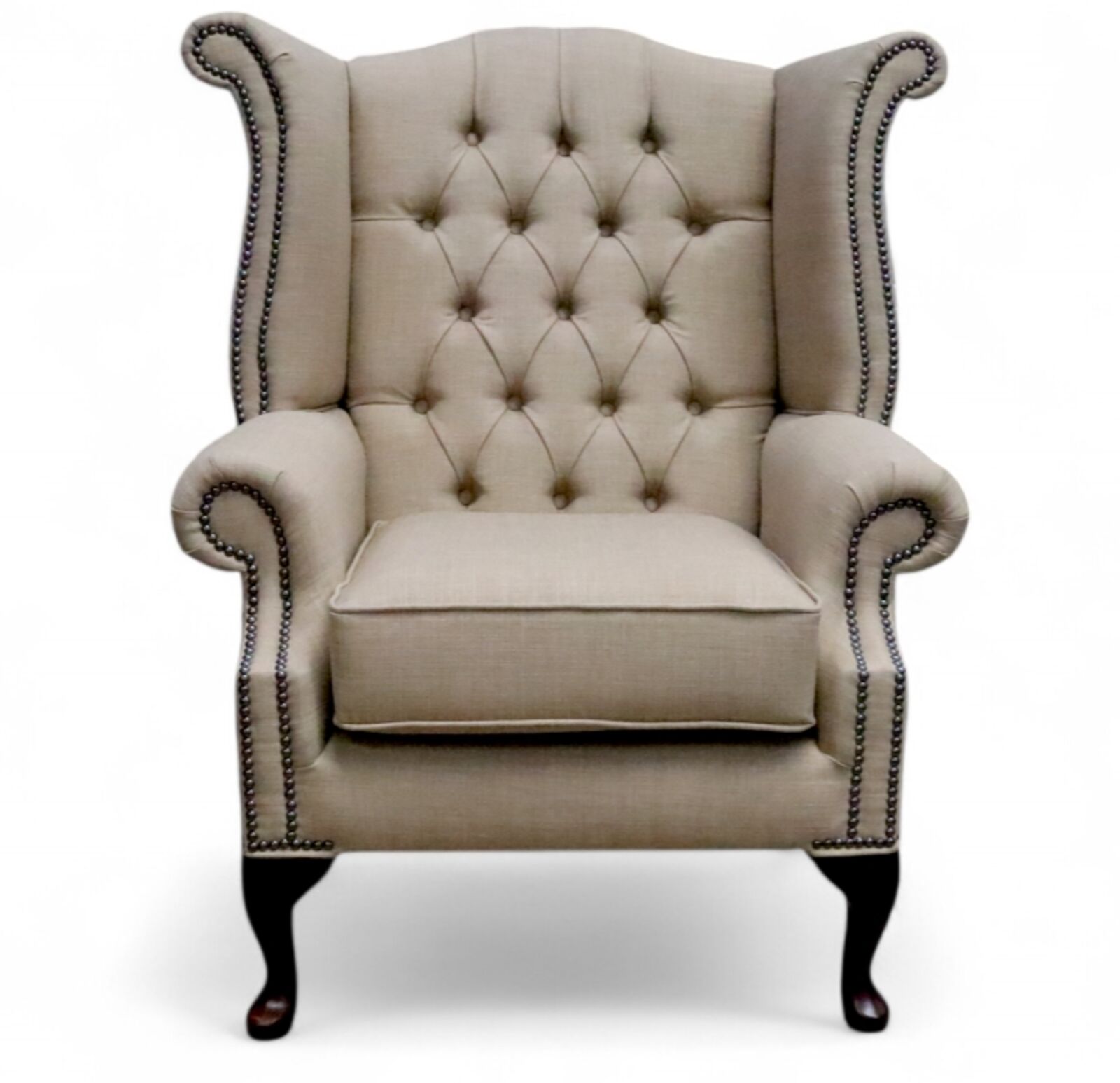 HANDCRAFTED IN ENGLAND Our Winged High-Back Chesterfield Queen Anne Armchair with exposed hardwood leg detail. A very popular look in the Chesterfield style. This Chesterfield has a high back for additional support and comfort. This piece would bring a flair to any home or office space. - Handmade In Linen - Non Tropical Screwed And Glued Hardwood Frame Made In House - Fully Handmade & Buttoned - Real Wood Show Feet Queen Anne Legs - Hand Studded Front And Wing Facings - From Construction Of The Wooden Frame To Filling In the Cushions all is completed In house (please visit) - Injection Moulded Foam Seat Cushions - Individual Seating Options to your requirements (soft, Medium, Firm) - Payment Option 50% Deposit Rest Of Balance On Delivery - FREE Swatch Service - We Deliver Worldwide (Please call/email for a free quotation) - 12 Month Manufacturers Guarantee - 2 Man Delivery - Room Of Choice In Own Vehicle (Pre Booked With Time Slot) Wing Chair Di