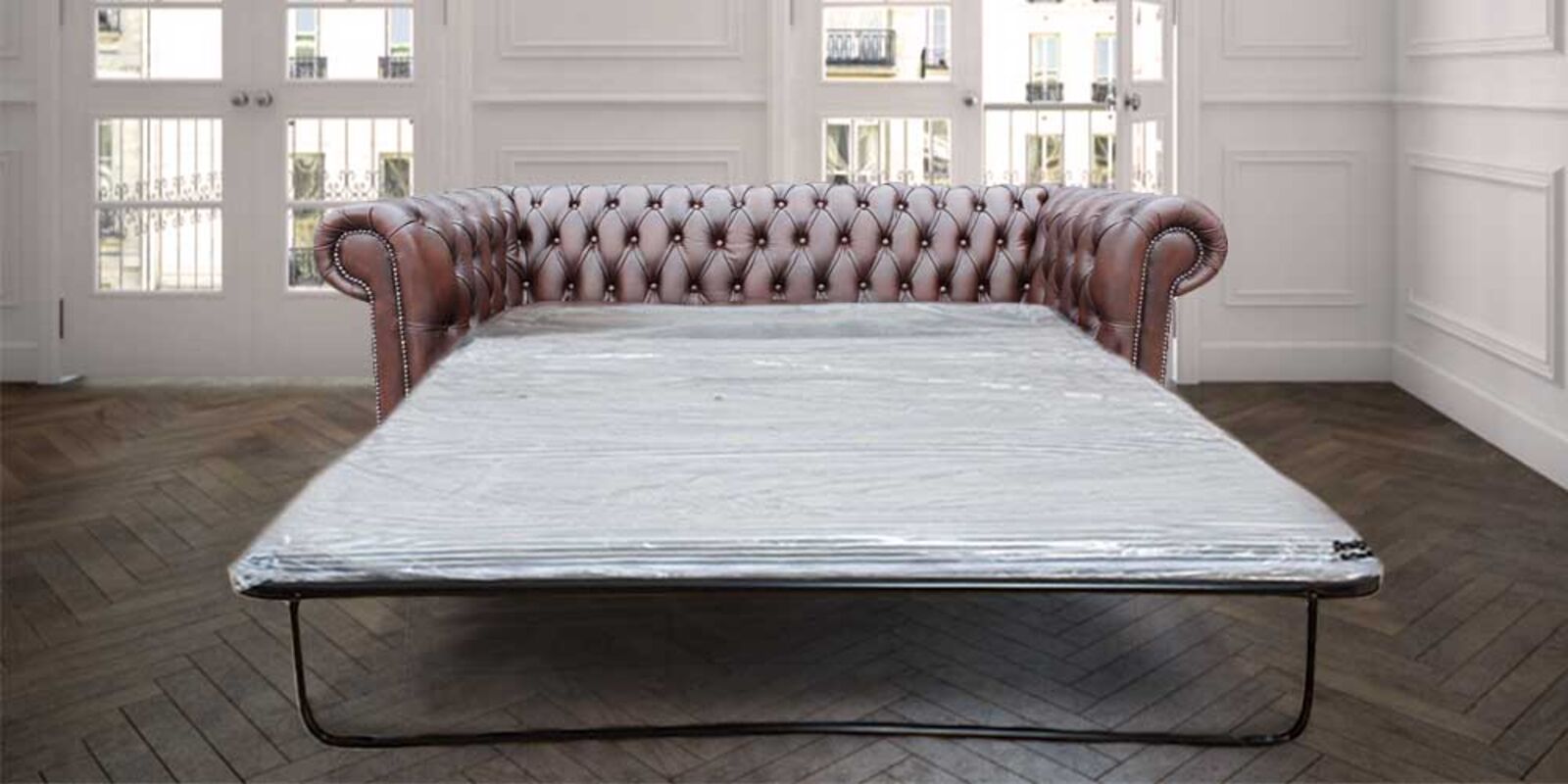 HANDCRAFTED IN ENGLAND The Chesterfield Classic Sofa Bed. The Chesterfield Leather Sofa Bed with it's unique Low Back Style, Deep Buttoned Arms and Back complemented with a Buttoned Front Border. The Scroll Fronted arms on the Chesterfield Leather Sofa Bed are attractively embellished with lines of individual stud nails. An undoubted winner in any room from the cottage to the boardroom. A classic of its kind ;Traditional Vintage British Style. - Handmade in Antique Brown Leather - Non Tropical Screwed and glued hardwood frame made in house - Upholstered and buttoned by craftsmen - Real wood Bunfeet - Hand studded - From construction of the frame to filling in the cushions all is completed in house. - Individual seating options (Fibre, Medium, Firm) - Payment Option 50% Deposit Rest of Balance on or before Delivery - FREE Swatch Sample Service to Help Decide on Colours & To See Material in Person (Highly Recommended) - FREE Swatch Service - 12 Mon