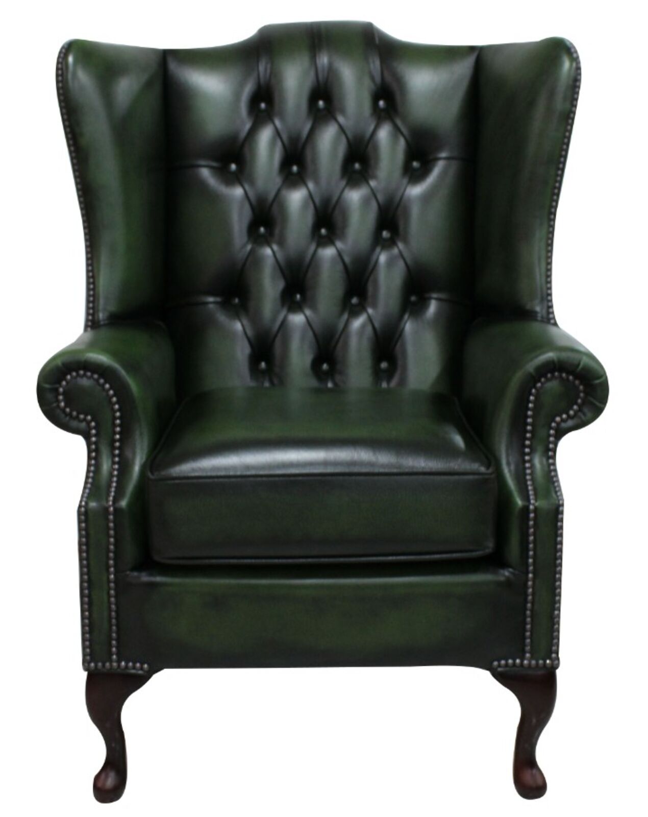 HANDCRAFTED IN ENGLAND Chesterfield Prince's Mallory Anne Wing Chair Our winged high-back Chesterfield Queen Anne Armchair with exposed hardwood leg detail. A very popular look in the Queen Anne Style THIS IS A ARMCHAIR FOR A TALLER PERSON This Chesterfield has a high back for additional support and comfort. This piece would bring flair to any home or office space. - Hand made in Antiqued Green Leather carefully rubbed to highlight the appearance of ageing - Suitable For the Larger Person - Non Tropical Screwed and glued hardwood frame made in house - Upholstered and buttoned by craftsmen - Real wood show feet Queen Anne legs - Hand studded Front and Wing Facings - From construction of the frame to filling in the cushions all is completed in house - Individual seating options (Fibre, Medium, Firm) - Payment Option 50% Deposit Rest of Balance On Delivery - FREE Swatch Service - 12 Month Manufacturers Guarantee - 10 Year Manufacture Guarantee on Fr