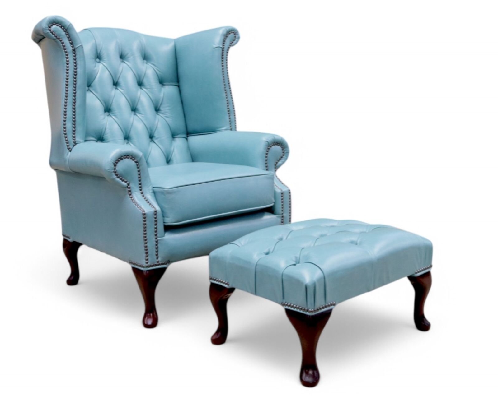 Our review of the Chesterfield Queen Anne High Back Chair Old English Placid Lake Blue Leather With Footstool