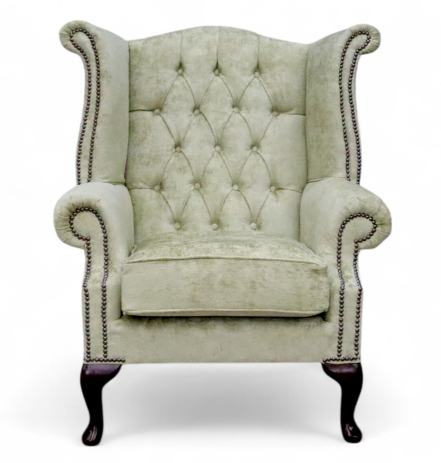 HANDCRAFTED IN ENGLAND Our Winged High-Back Chesterfield Queen Anne Armchair with exposed hardwood leg detail. A very popular look in the Chesterfield style. This Chesterfield has a high back for additional support and comfort. This piece would bring a flair to any home or office space. - Handmade In Nuovo Fabric - Non Tropical Screwed And Glued Hardwood Frame Made In House - Fully Handmade & Buttoned - Real Wood Show Feet Queen Anne Legs - Hand Studded Front And Wing Facings - From Construction Of The Wooden Frame To Filling In the Cushions all is completed In house (please visit) - Injection Moulded Foam Seat Cushions - Individual Seating Options to your requirements (soft, Medium, Firm) - Payment Option 50% Deposit Rest Of Balance On Delivery - FREE Swatch Service - We Deliver Worldwide (Please call/email for a free quotation) - 12 Month Manufacturers Guarantee - 2 Man Delivery - Room Of Choice In Own Vehicle (Pre Booked With Time Slot) Wing C