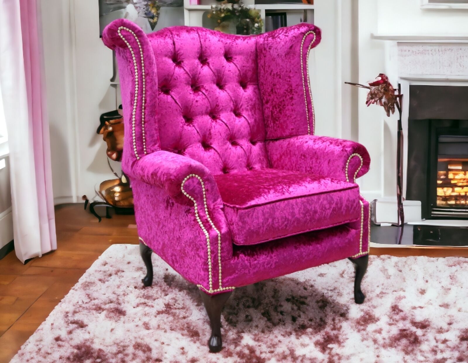 Our review of the Chesterfield Queen Anne High Back Wing Chair Shimmer Fuchsia Velvet