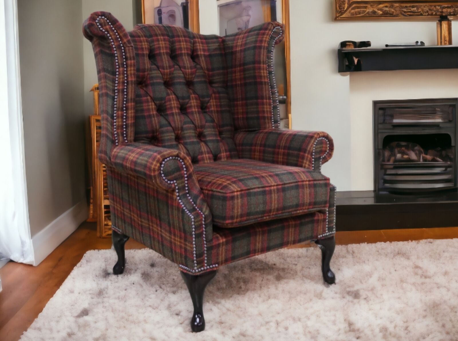 Chesterfield Queen Anne Wool Tweed Wing Chair Fireside High Back Armchair Sandringham Mandarin Check