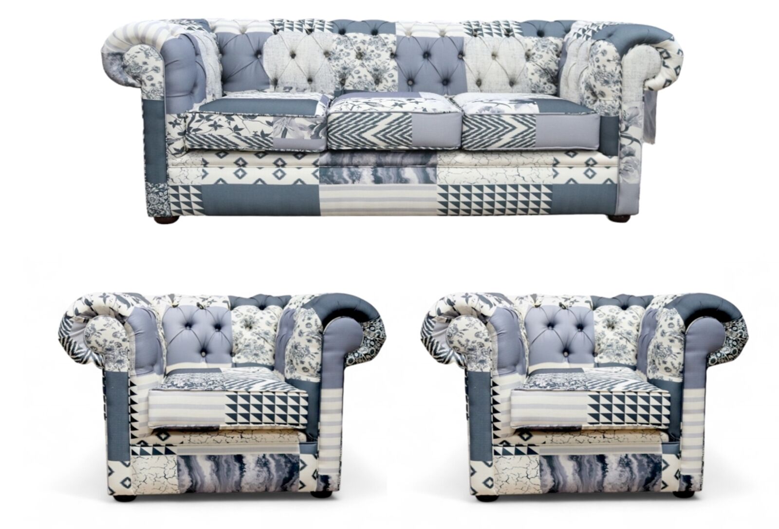 HANDCRAFTED IN ENGLAND The Chesterfield Classic Sofa. The Chesterfield Leather Sofa with it's unique Low Back Style, Deep Buttoned Arms and Back complemented with a Buttoned Front Border. The Scroll Fronted arms on the Chesterfield Leather Sofa are attractively embellished with lines of individual stud nails. An undoubted winner in any room from the cottage to the boardroom. A classic of its kind ;Traditional Vintage British Style. Handmade in Chenille - Handmade in Charles Patchwork - Non Tropical Screwed and glued hardwood frame made in house - Upholstered and buttoned by craftsmen - Real wood Bunfeet - Hand studded - From construction of the frame to filling in the cushions all is completed in house. - Individual seating options (Soft, Medium, Firm) - Payment Option 50% Deposit Rest of Balance On Delivery - FREE Swatch Service - 12 Month Manufacturers Guarantee - 10 Year Manufacture Guarantee on Framework - Manufactured In England - Worldwide