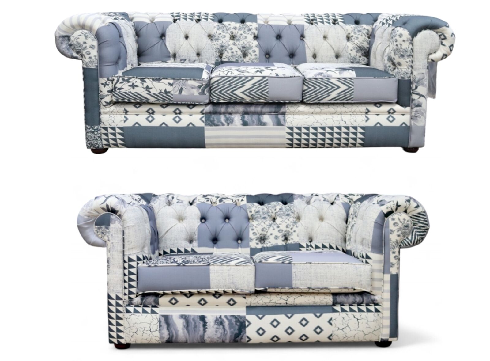 HANDCRAFTED IN ENGLAND The Chesterfield Classic Sofa. The Chesterfield Leather Sofa with it's unique Low Back Style, Deep Buttoned Arms and Back complemented with a Buttoned Front Border. The Scroll Fronted arms on the Chesterfield Leather Sofa are attractively embellished with lines of individual stud nails. An undoubted winner in any room from the cottage to the boardroom. A classic of its kind ;Traditional Vintage British Style. Handmade in Chenille - Handmade in Charles Patchwork - Non Tropical Screwed and glued hardwood frame made in house - Upholstered and buttoned by craftsmen - Real wood Bunfeet - Hand studded - From construction of the frame to filling in the cushions all is completed in house. - Individual seating options (Soft, Medium, Firm) - Payment Option 50% Deposit Rest of Balance On Delivery - FREE Swatch Service - 12 Month Manufacturers Guarantee - 10 Year Manufacture Guarantee on Framework - Manufactured In England - Worldwide