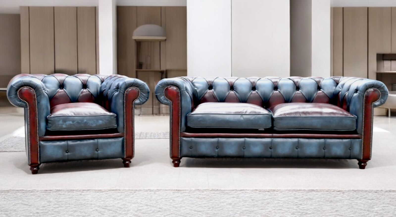HANDCRAFTED IN ENGLAND The Duke Chesterfield Classic Sofa Suite consists of a 3 seater and 1 seater. The Chesterfield Leather Sofa with it's unique Low Back Style, Deep Buttoned Arms and Back complemented with a Buttoned Front Border. The Scroll Fronted arms on the Chesterfield Leather Sofa Bed are attractively embellished with lines of individual stud nails. An undoubted winner in any room from the cottage to the boardroom. A classic of its kind ;Traditional Vintage British Style. - Handmade in Antique Leather - Non Tropical Screwed and glued hardwood frame made in house - Upholstered and buttoned by craftsmen - Real wood Bunfeet - Hand studded - From construction of the frame to filling in the cushions all is completed in house. - Individual seating options (Fibre, Medium, Firm) - Payment Option 50% Deposit Rest of Balance on or before Delivery - FREE Swatch Service - 12 Month Manufacturers Guarantee - 10 Year Manufacture Guarantee on Framework