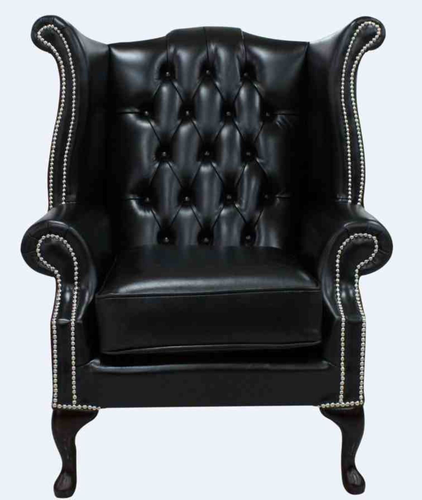Old English Black Leather Chesterfield Queen Anne High Back Wing Chair Designersofas4u