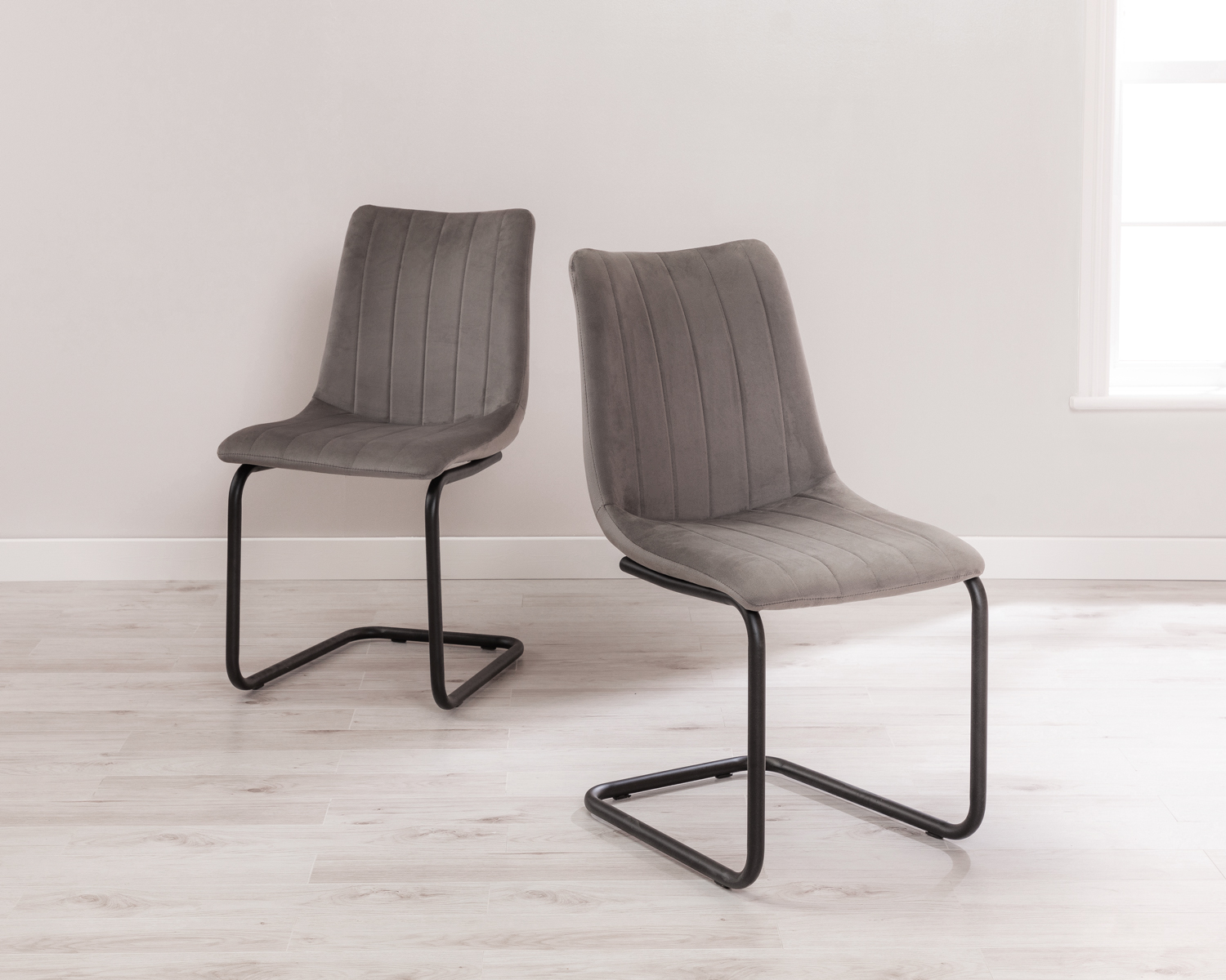 Pair of Bailey Grey Velvet Dining Chairs PAIR OF BAILEY GREY VELVET DINING CHAIRS A contemporary dining chair that’ll suit the look of any style of home interior, what’s not to love? Meet Bailey, our unique dining chair collection. Features Luxurious grey velvet upholstery Velvet upholstery is coated with Teflon protection, resisting spillages and stains Hand-stitched button back design chair Long-lasting assorted hardwood frame High carbon steel S spring with polyester webbing to prevent sagging High quality, high-density foam for superior comfort Anti-scratch pads to protect your hard surfaces Simple instruction manual for easy assembly CLASSIC LOOK The grey velvet upholstery is on-trend, so no matter the style of your interior, this is a must-have if you’re wanting to make mealtimes extra special. MAKE A STATEMENT Intricate panelled stitching gives the Bailey collection its unique look and the slight curvature of the backrest will give y