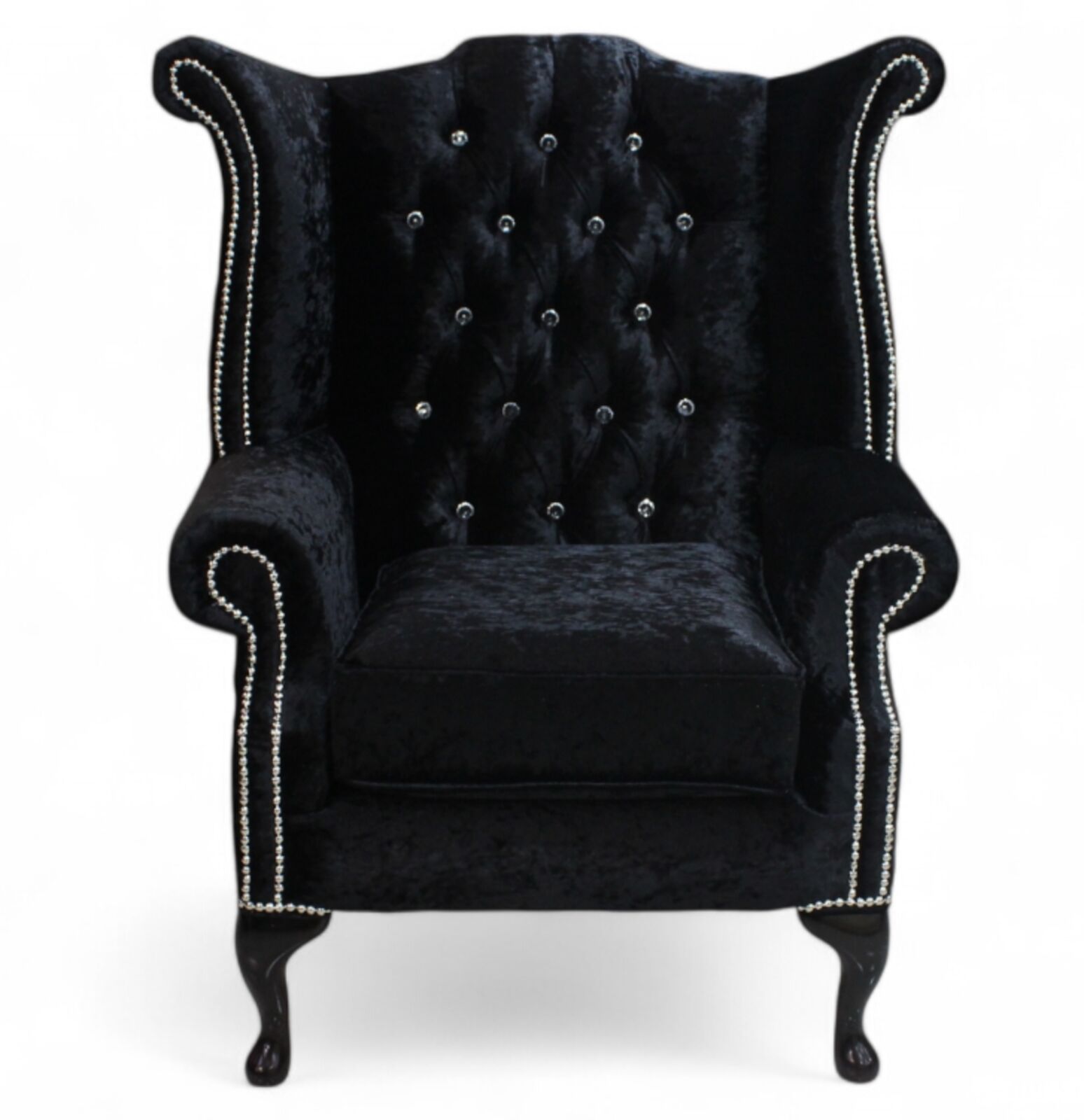 Shimmer Black Velvet Chesterfield Crystal Diamante Queen Anne High Back Wing Designersofas4u