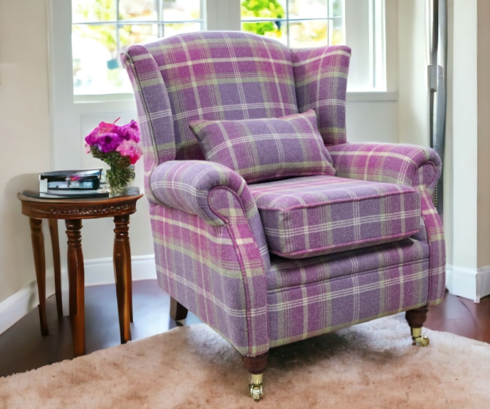 We have been looking around for a while, and we really love this Wing Chair Fireside High Back Armchair Balmoral Amethyst Check Fabric P Amp S.