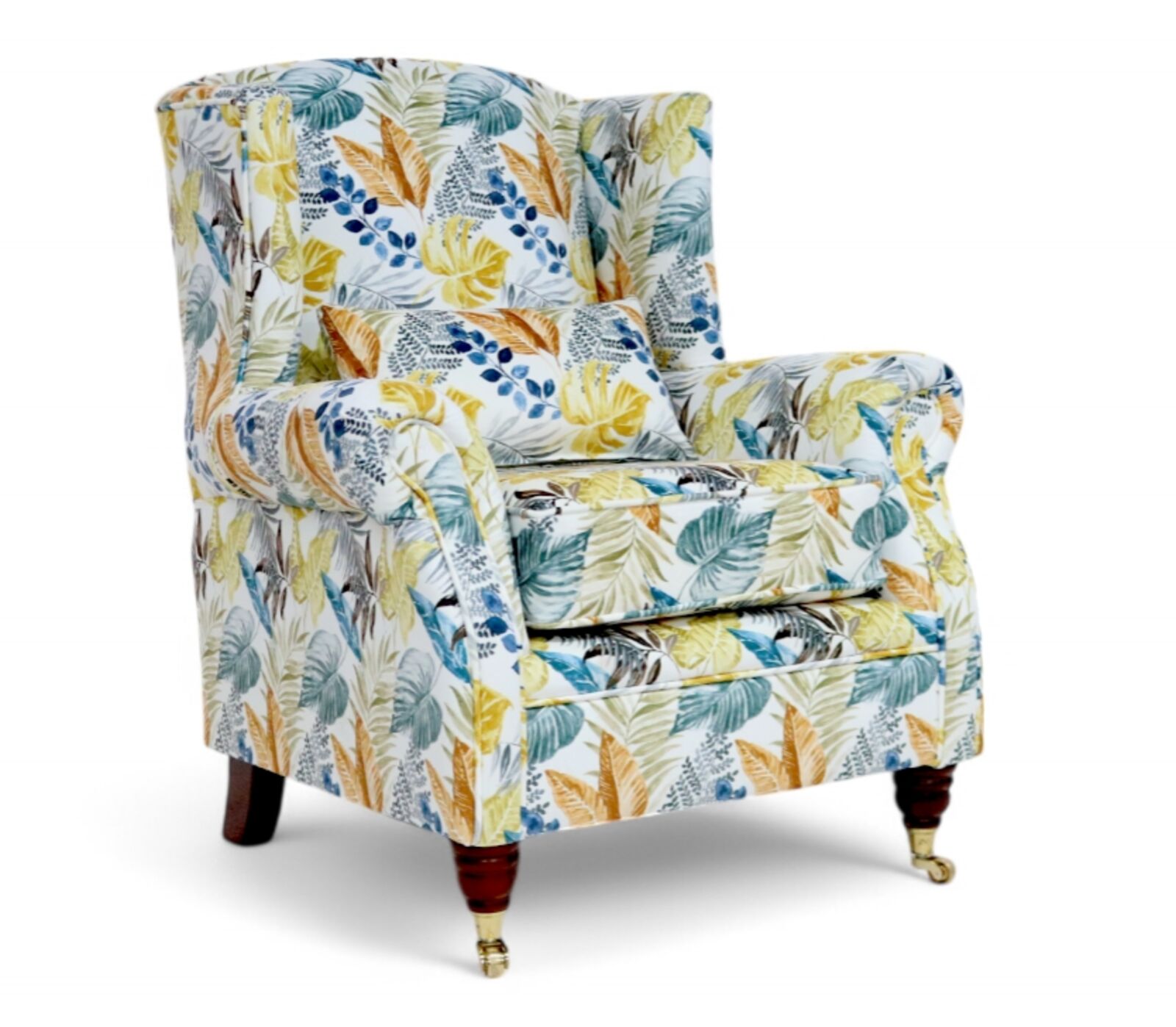 This traditionally styled wing chair has polyester fibre seat cushion and high tensile comfy cushions. Featuring hardwood Turned Mahogany Brass legs with rollers. Upholstered in Luxurious Designer Fabric exclusively available from Designer Sofas4u. If you are looking for style and reliability, our ever popular wing chair has come to define what traditional styling is all about. Designer Sofas4U Wing Chair also available in customers own fabric. If you would like to make use of our NEXT DAY FREE SWATCH SERVICE please contact us by telephone or email with the name of the product you are interested in. Wings Chair Dimensions : H 98cm x W 80cm x D 80cm apprx. Dimensions-1-seater-Southwold-Fireside-Chair: We understand that purchasing furniture is a household decision. Therefore in order to make this stress free, we offer all our customers: - FREE swatches to help decide on colours - FREE impartial advice on the suitability of products - Manufacture B